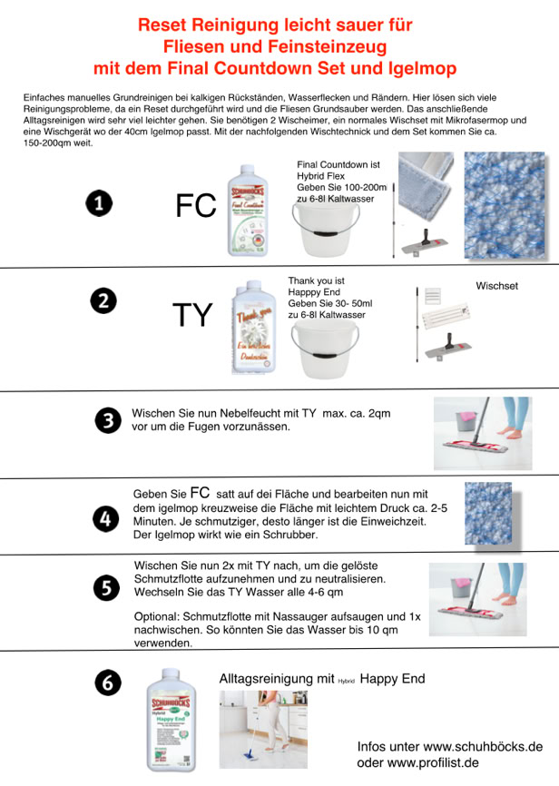 Einfache Bauendreinigung und Grundreinigung, leicht sauer für Fliesen und Feinsteinzeug. Wischverfahren Für Privatanwender gut geeignet.